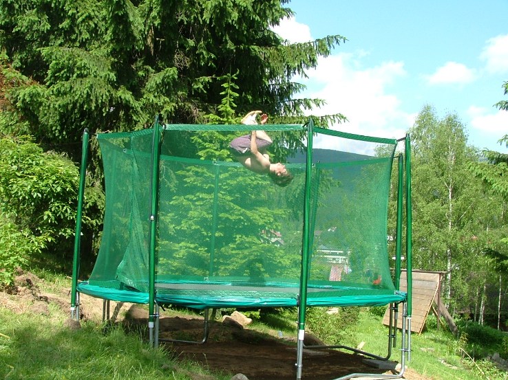 zahrada, plastik. bazen, ohniště, trampolína, gril